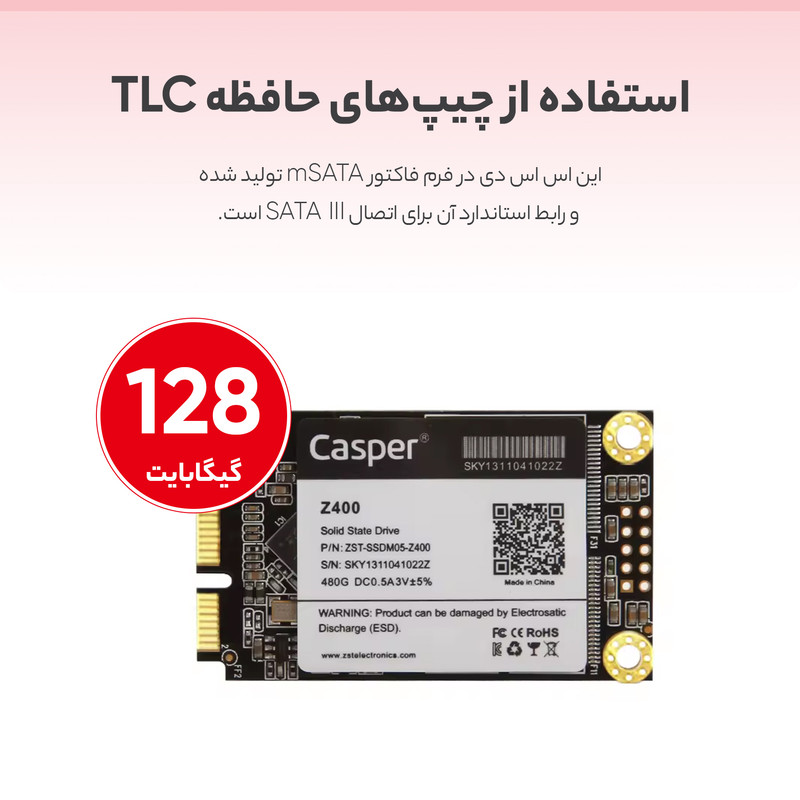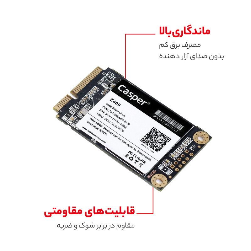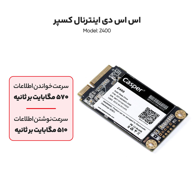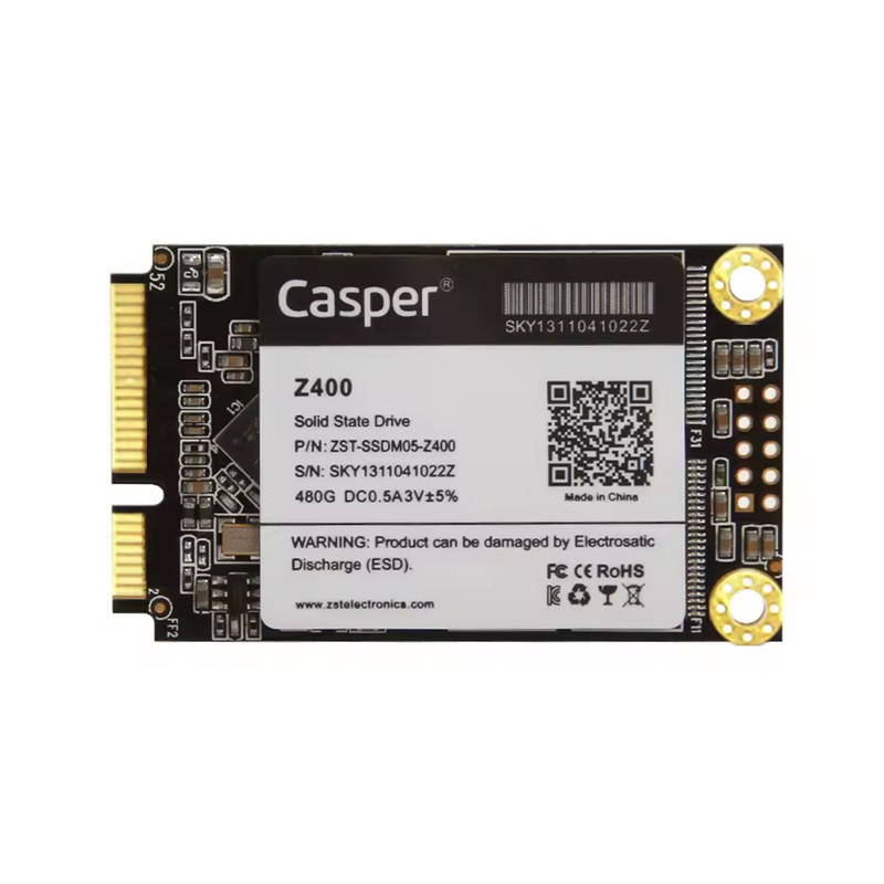 اس اس دی «Z400» محصولی از برند «کسپر» (Casper) است. این اس اس دی در فرم فاکتور mSATA تولید شده و رابط استاندارد آن برای اتصال SATA III است. استفاده از چیپهای حافظه TLC یکی از نکات برجستهای است که در این محصول باید به آن اشاره کرد. استفاده از NAND های TLC باعث شده تا هزینهی تمامشدهی محصول در حد خوبی باقی بماند و شمار زیادی از کاربران بتوانند آن را تهیه کنند. حداکثر سرعت خواندن در Z400 به 570 مگابایت بر ثانیه میرسد و سرعت نوشتن روی آن 510 مگابایت بر ثانیه است. مثل تمام حافظههای اس اس دی، Z400 هم برتریهای غیرقابل انکاری در مقایسه به هارددیسکهای مکانیکی دارد. این محصول در مقابل ضربه از هارددیسک مقاومتر است و به دلیل نداشتن قطعهی مکانیکی، وارد آمدن شوک روی عملکرد آن تااثیری نمیگذارد.