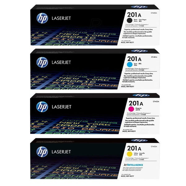 پک چهار عددی کارتریج اچ پی 201A جهت استفاده در پرینتر های لیزری رنگی اچ پی طراحی شده با کد فنی CF400A- CF401A- CF402A- CF403A میباشد.ظرفیت چاپ کارتریج 201A رنگی معادل 1400 برگ(سه عدد) و نوع سیاه آن 1500 برگ است یعنی توانایی آن را دارد که این تعداد صفحه A4 را با میزان پوشش 5 درصدی متن یا تصویر برای شما چاپ کند.که پرینترهای سازگارش M277n-M277dw-M252n-M252dw-M274n-M277c6 می باشد.